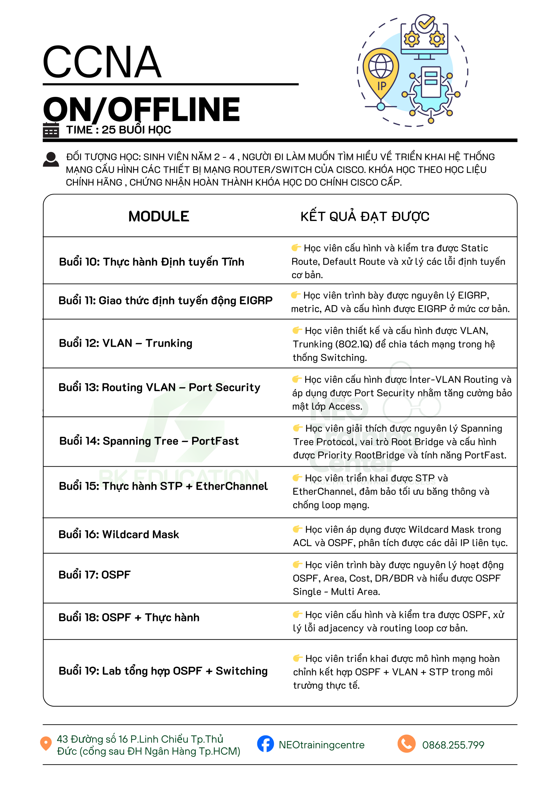 Khóa học CCNA tại NEO được thiết kế theo lộ trình từ nền tảng đến nâng cao, giúp học viên nắm vững toàn bộ kiến thức mạng máy tính và sẵn sàng đi làm thực tế.