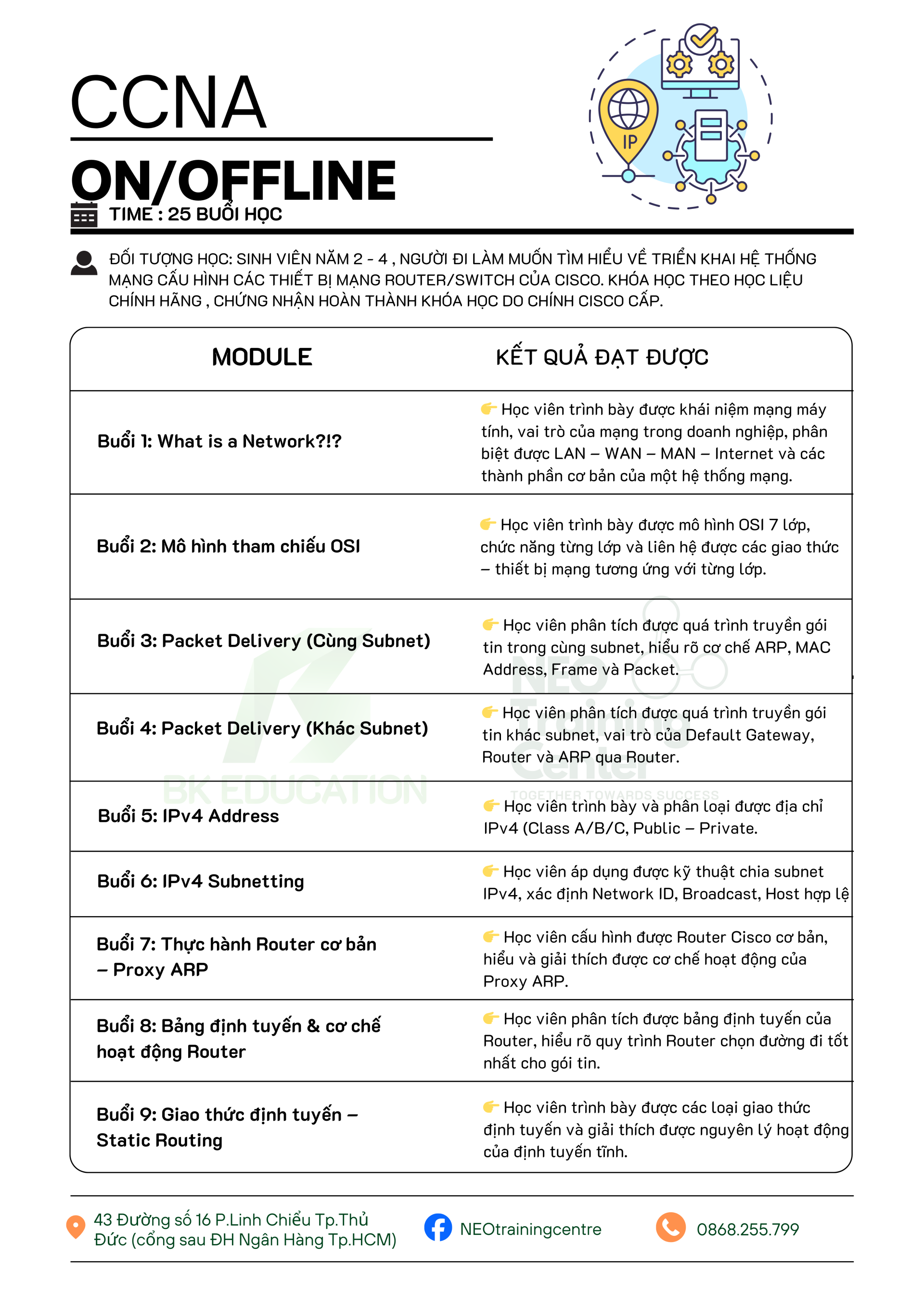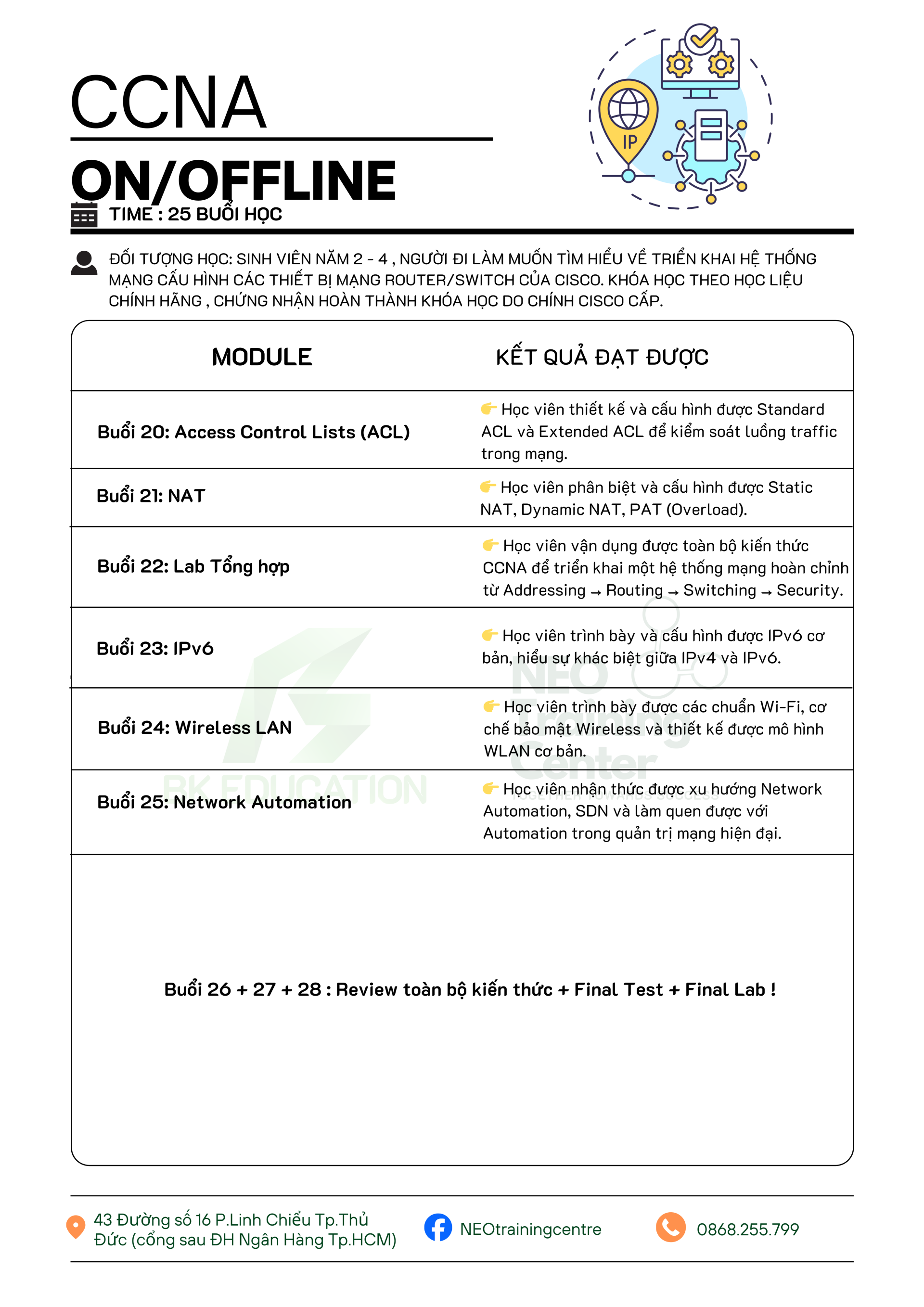 Khóa học CCNA tại NEO được thiết kế theo lộ trình từ nền tảng đến nâng cao, giúp học viên nắm vững toàn bộ kiến thức mạng máy tính và sẵn sàng đi làm thực tế.