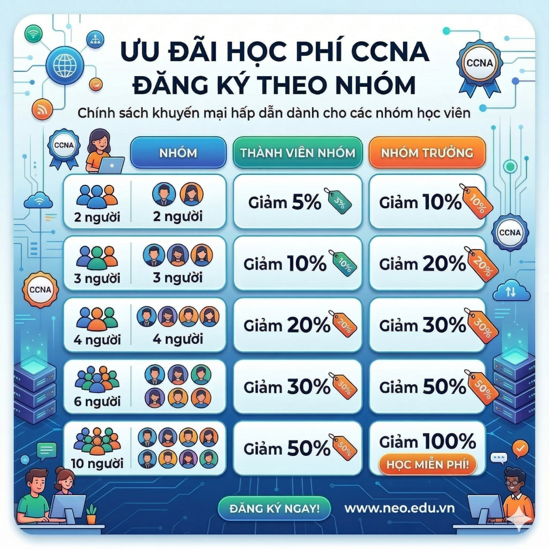 - Tặng 180$ (~60%) lệ phí thi CCNA quốc tế