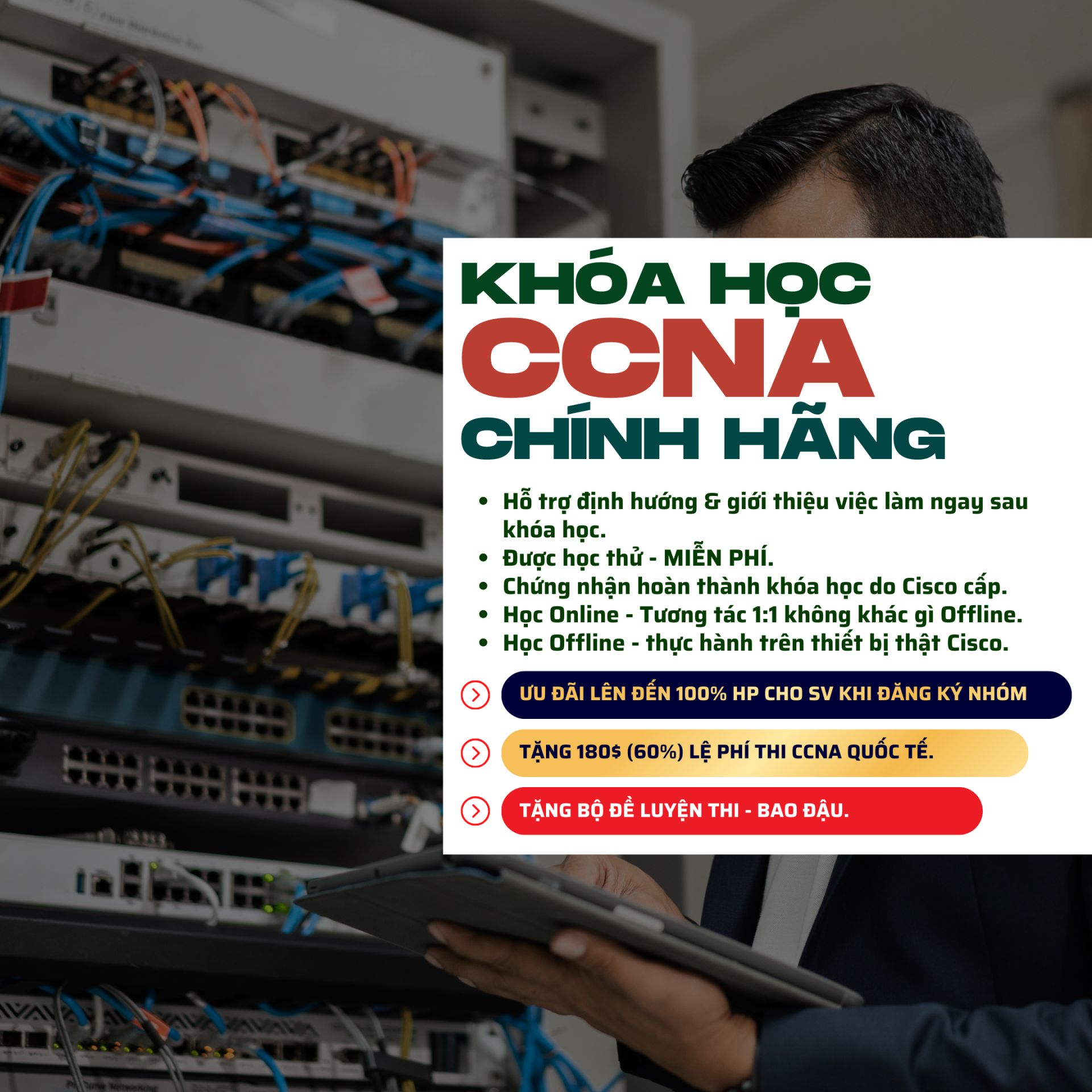 CCNA (Cisco Certified Network Associate) là chứng chỉ quốc tế do Cisco cấp, xác nhận bạn có nền tảng vững chắc về mạng máy tính như Routing, Switching, IP, Network Security và các công nghệ mạng hiện đại. Đây là bước khởi đầu tiêu chuẩn cho bất kỳ ai muốn theo đuổi lĩnh vực Network, CyberSecurity hoặc Cloud.