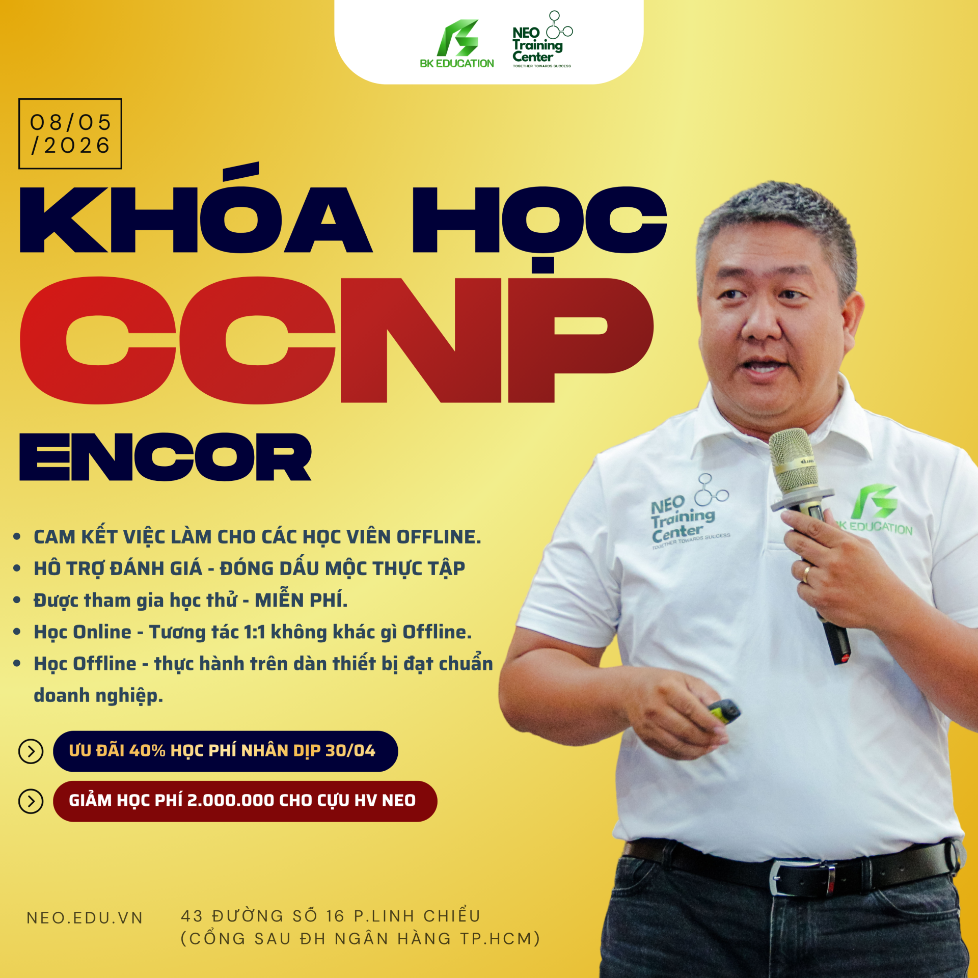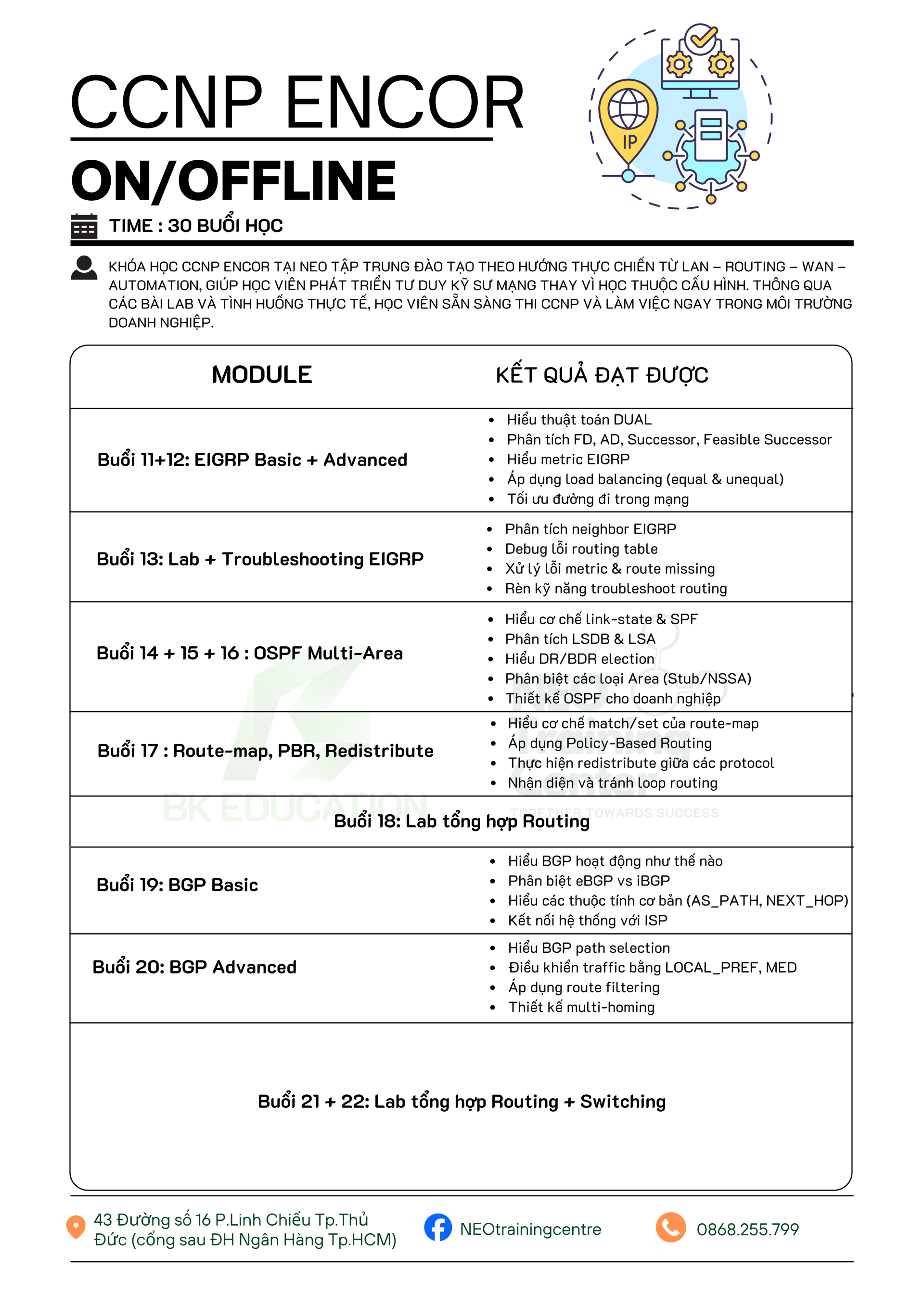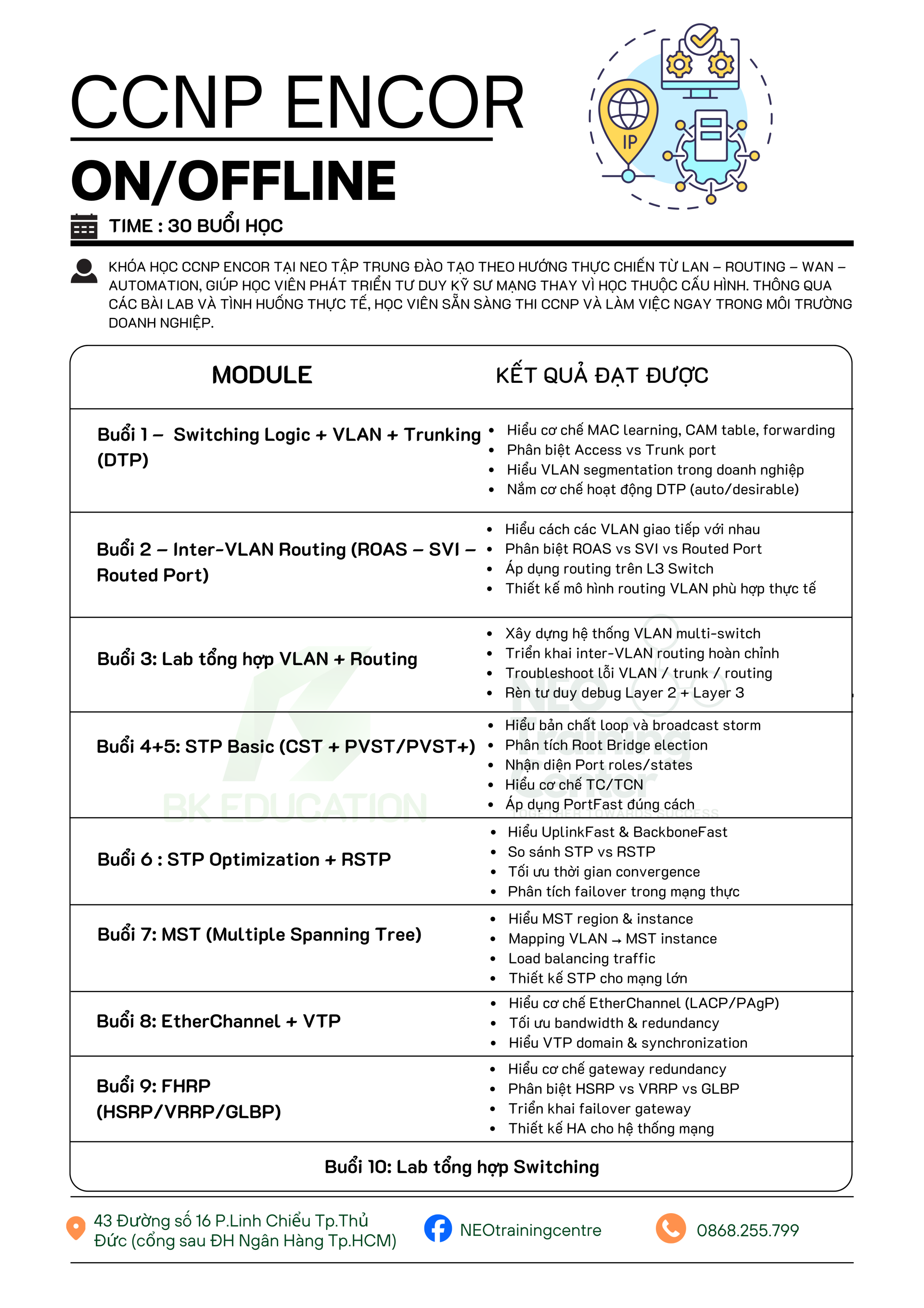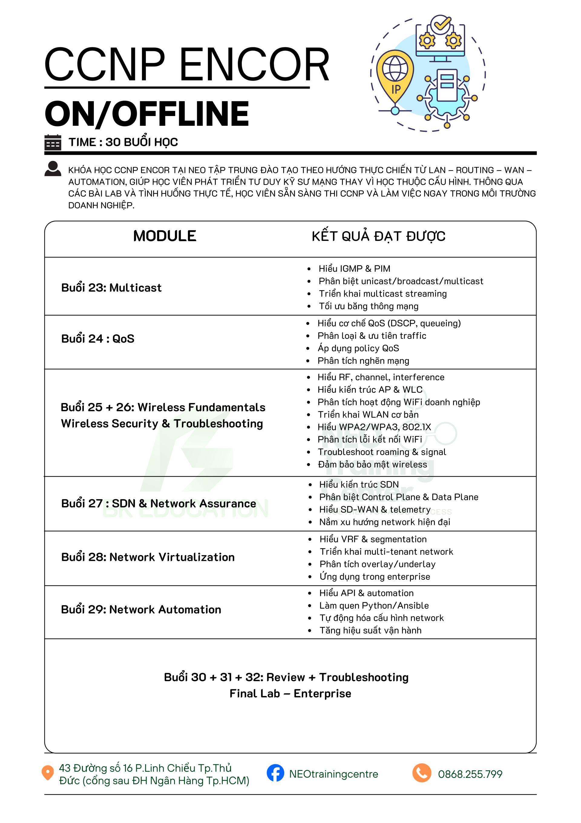 Khóa học CCNP ENCOR tại NEO tập trung đào tạo theo hướng thực chiến từ LAN – Routing – WAN – Automation, giúp học viên phát triển tư duy kỹ sư mạng thay vì học thuộc cấu hình. Thông qua các bài lab và tình huống thực tế, học viên sẵn sàng thi CCNP và làm việc ngay trong môi trường doanh nghiệp.